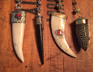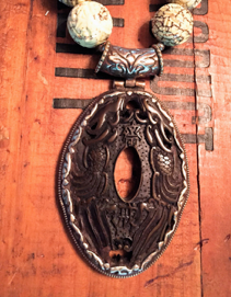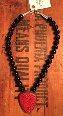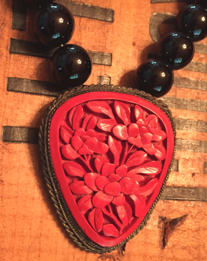 Fabulous cinnabar pendant on natural turquoise beads (carved with ‘long life’) and carved wood beads with sterling end caps