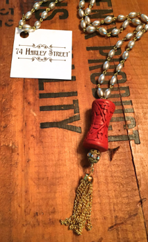Vintage cinnabar pendant with dangling tassel on glass pearl chain
