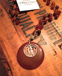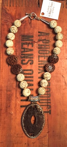 Fabulous cinnabar pendant on natural turquoise beads (carved with ‘long life’) and carved wood beads with sterling end caps