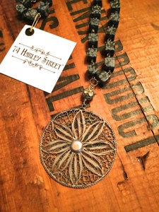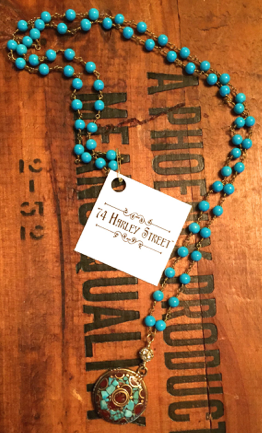 Fun brass and turquoise chip pendant on turquoise glass chain